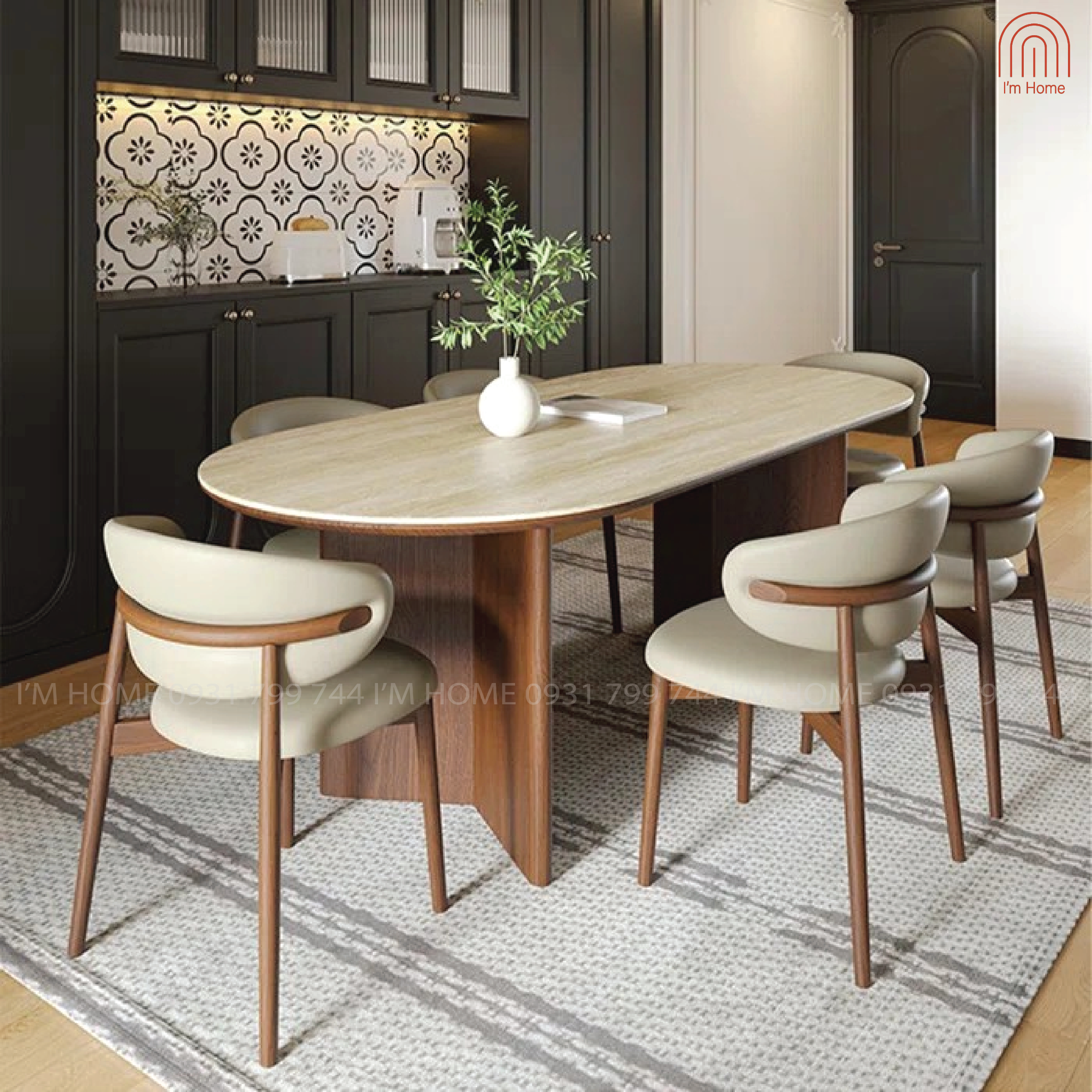 Mặt bàn sử dụng chất liệu đá Travertine, giúp tăng thêm vẻ sang trọng và thanh lịch cho không gian