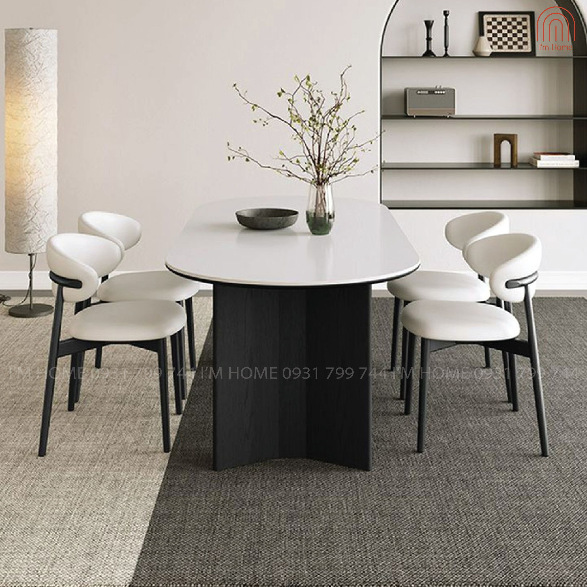 Mặt bàn sử dụng chất liệu đá trắng sứ, giúp tăng thêm vẻ sang trọng và thanh lịch cho không gian