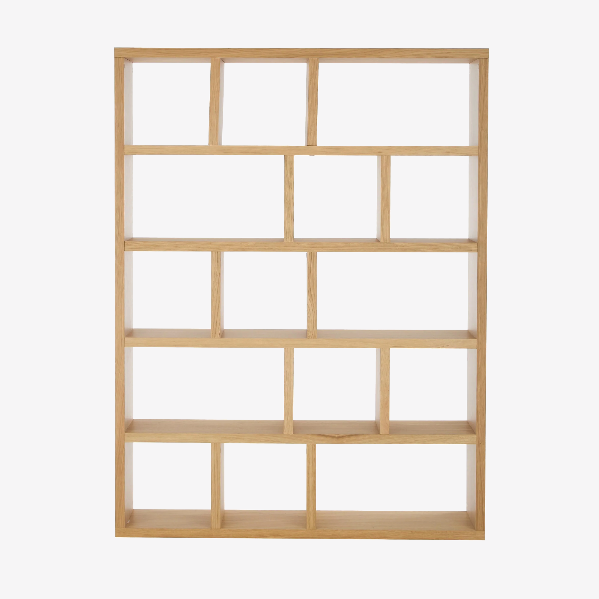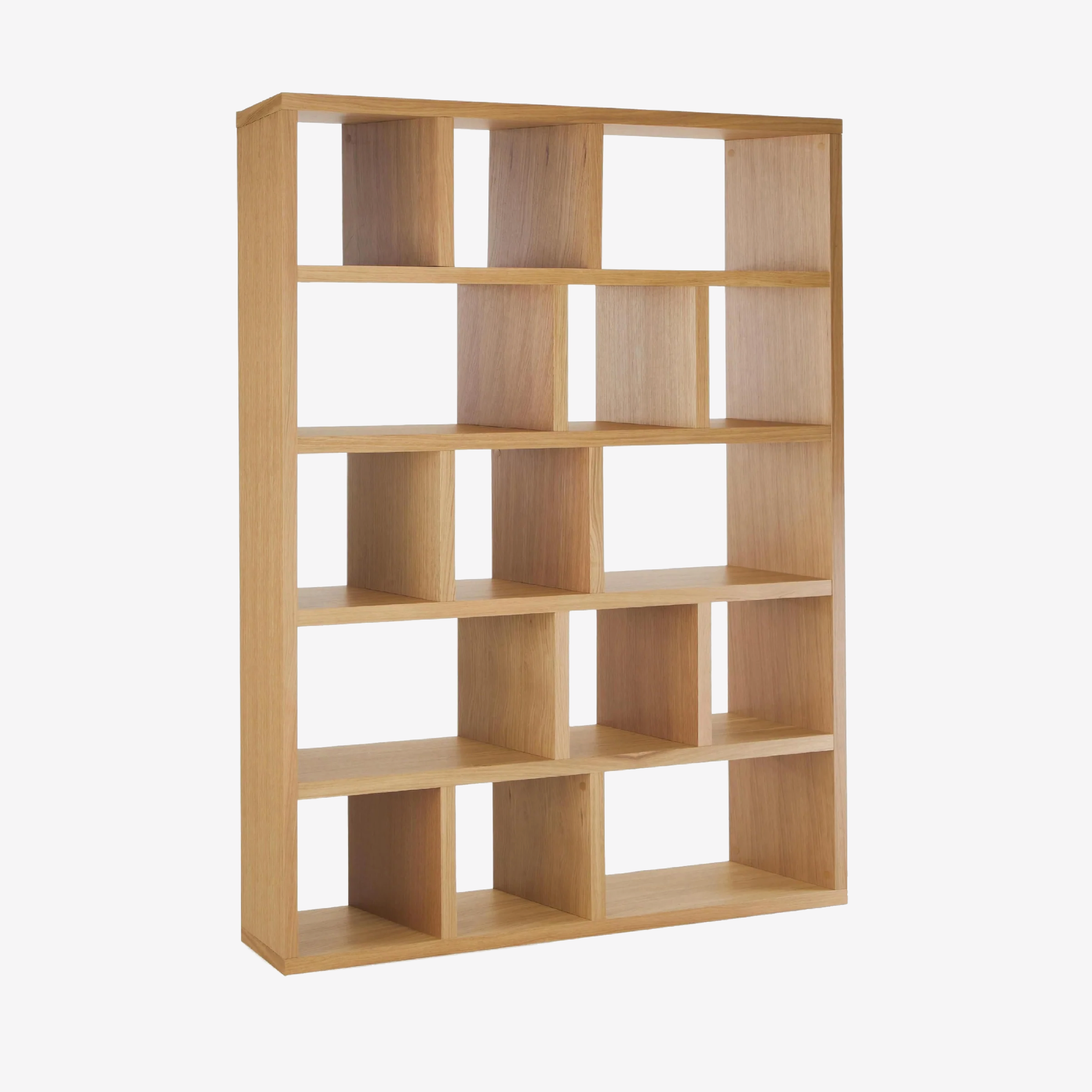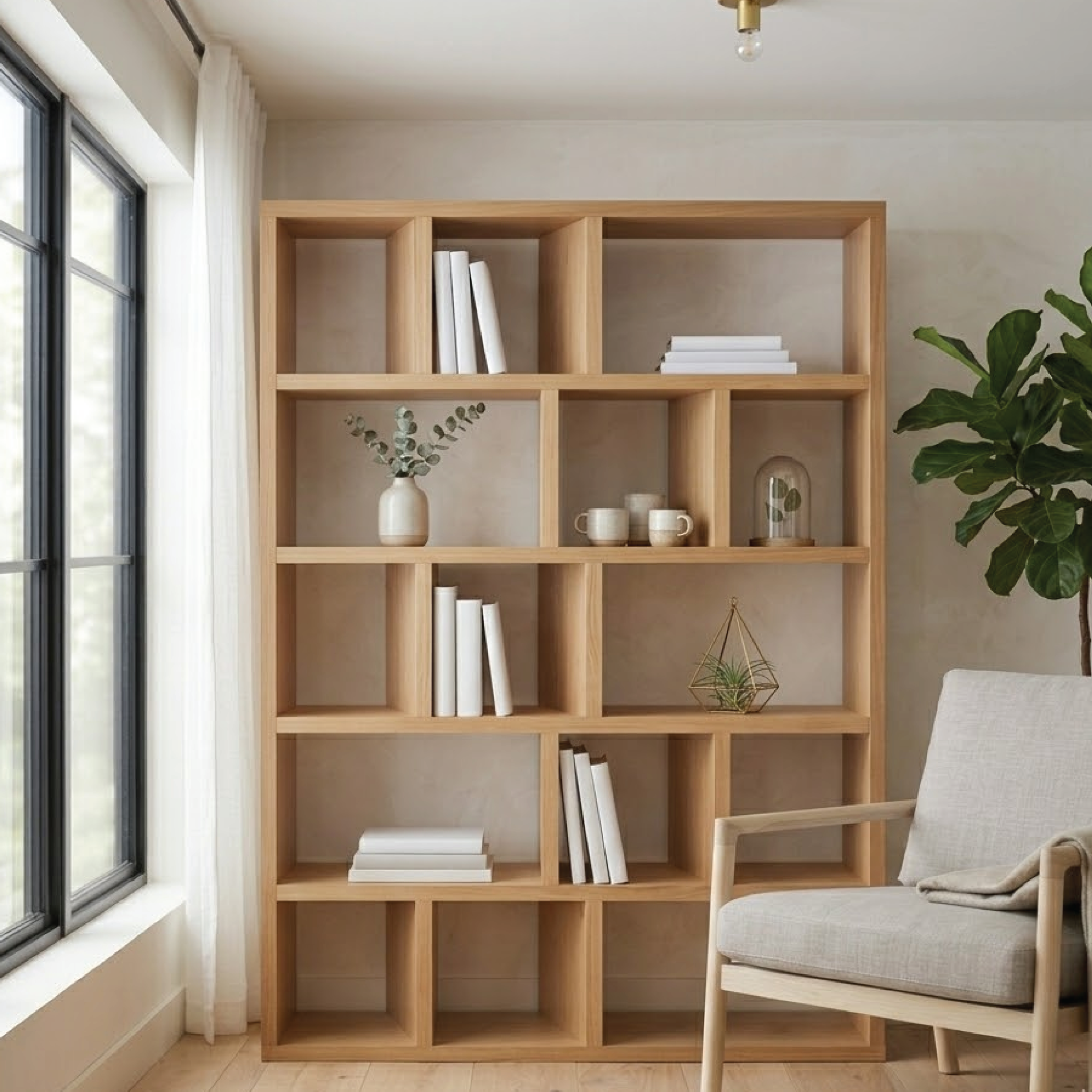 Thiết kế tối giản & thanh mảnh: Kệ nổi bật với cách phân chia các ô lưu trữ có kích thước khác nhau, tạo nên hình khối thú vị và tối ưu hóa diện tích cho nhiều loại vật dụng.