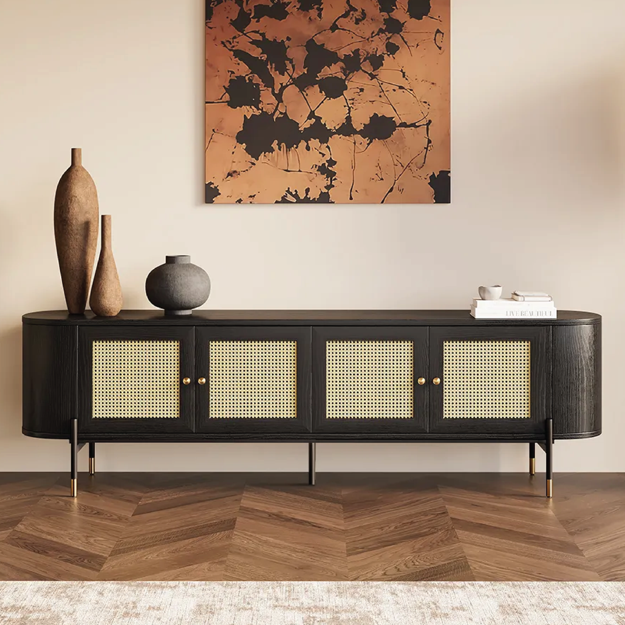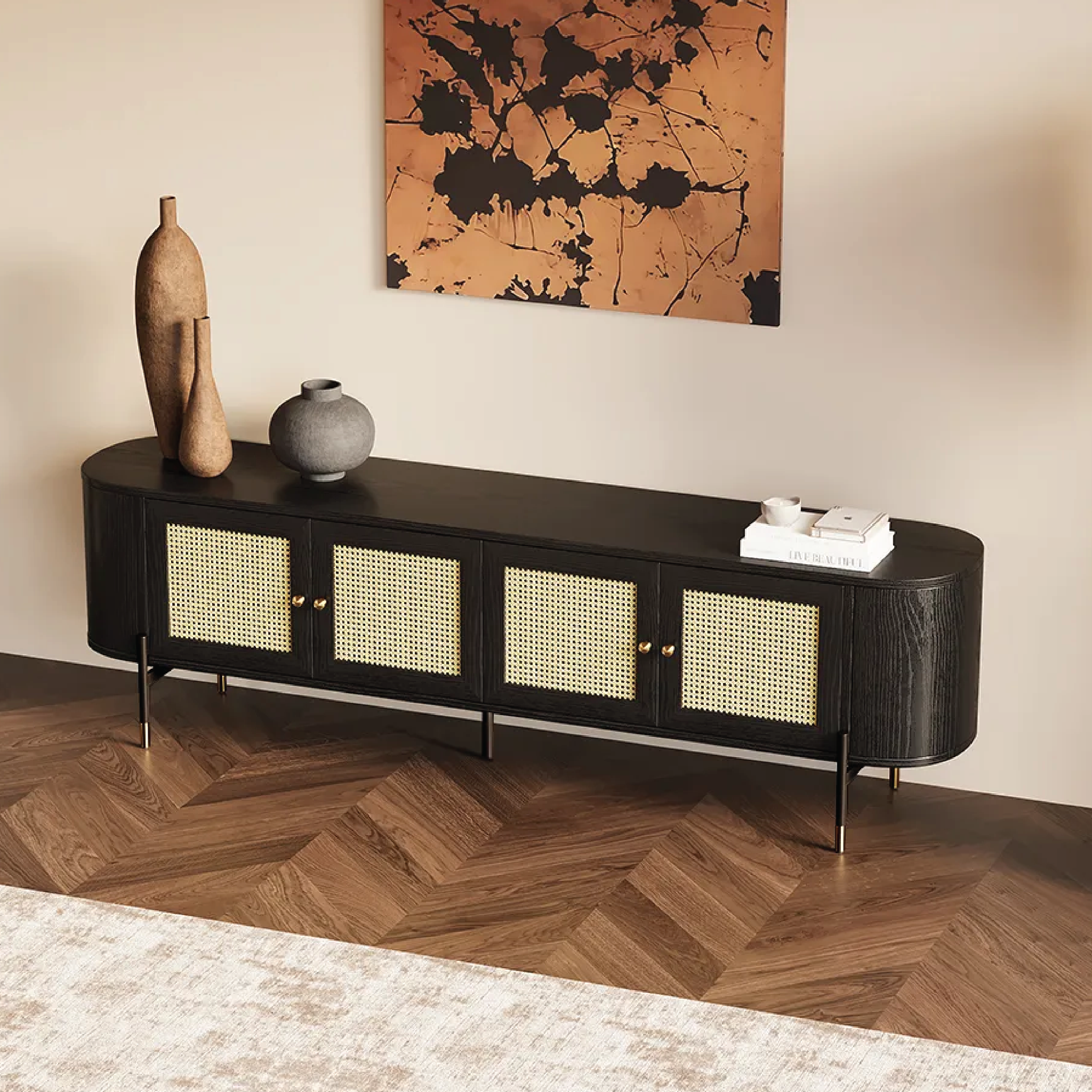 Kệ TV mang sự kết hợp hoàn hảo giữa chi tiết bo tròn mềm mại phối mây đan lấy cảm hứng từ phong cách Indochine