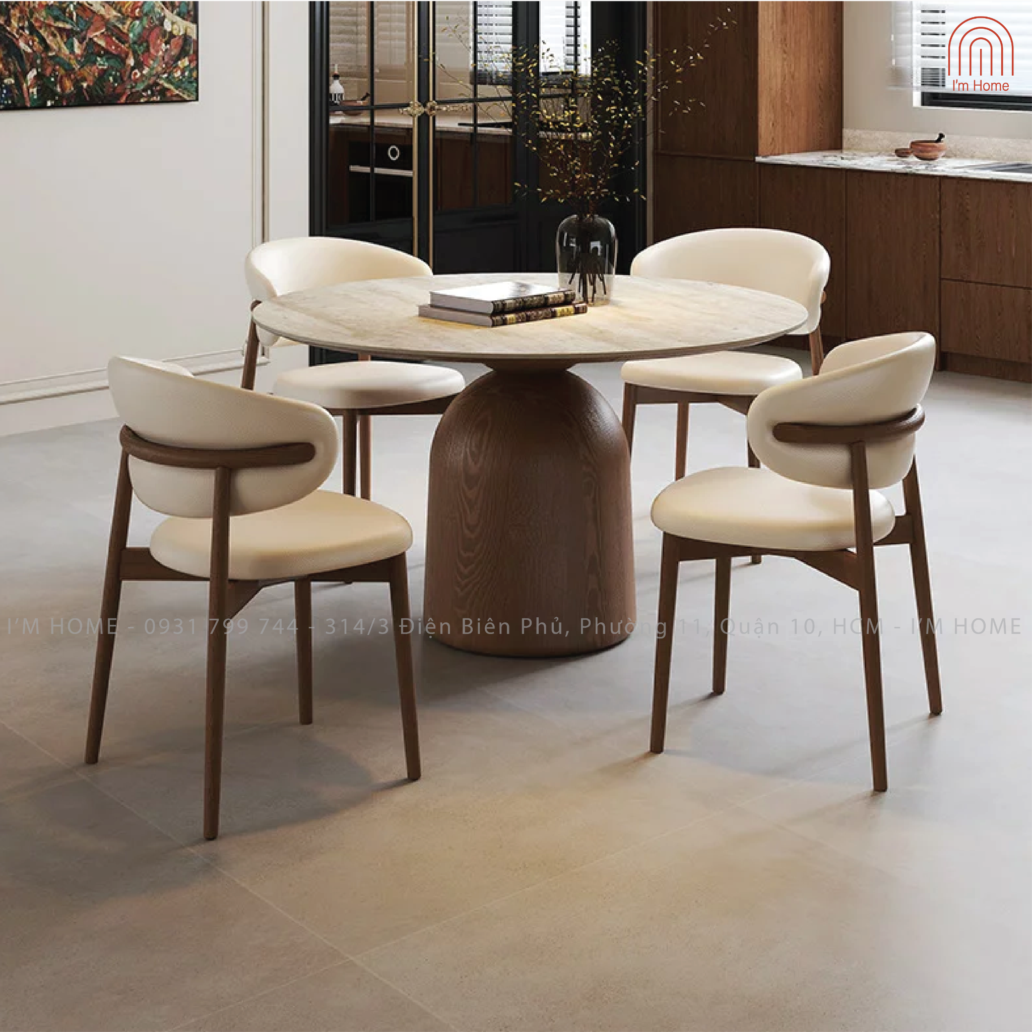 Bàn ăn tròn với thiết kế mặt bàn hình tròn mềm mại, tạo cảm giác gần gũi và phù hợp với nhiều không gian nội thất
